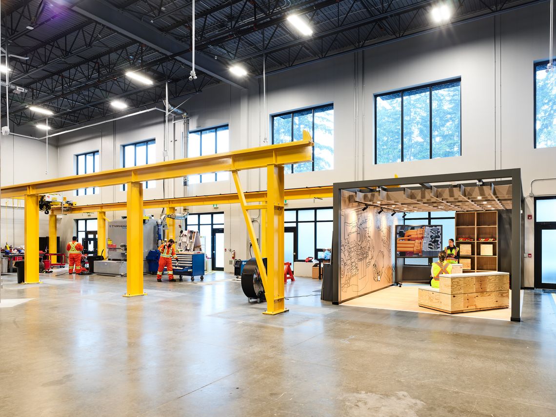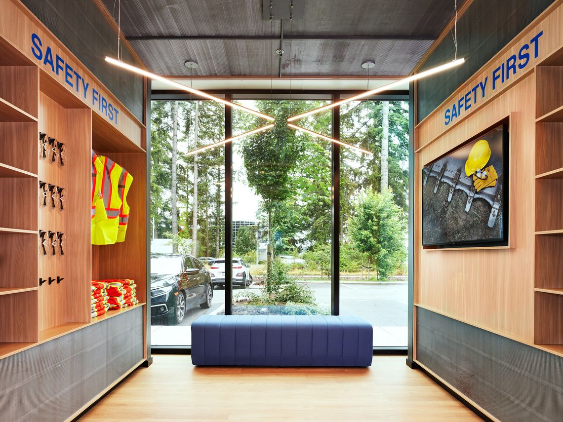 Taking Scandinavian branding and design inspiration from their client’s head office in Sweden, M Moser and Associates’ clever design for a large warehouse, workshop, and office combines all three functions in one commodious, delightful space in what would otherwise be a nondescript tilt-up warehouse space in South Surrey.