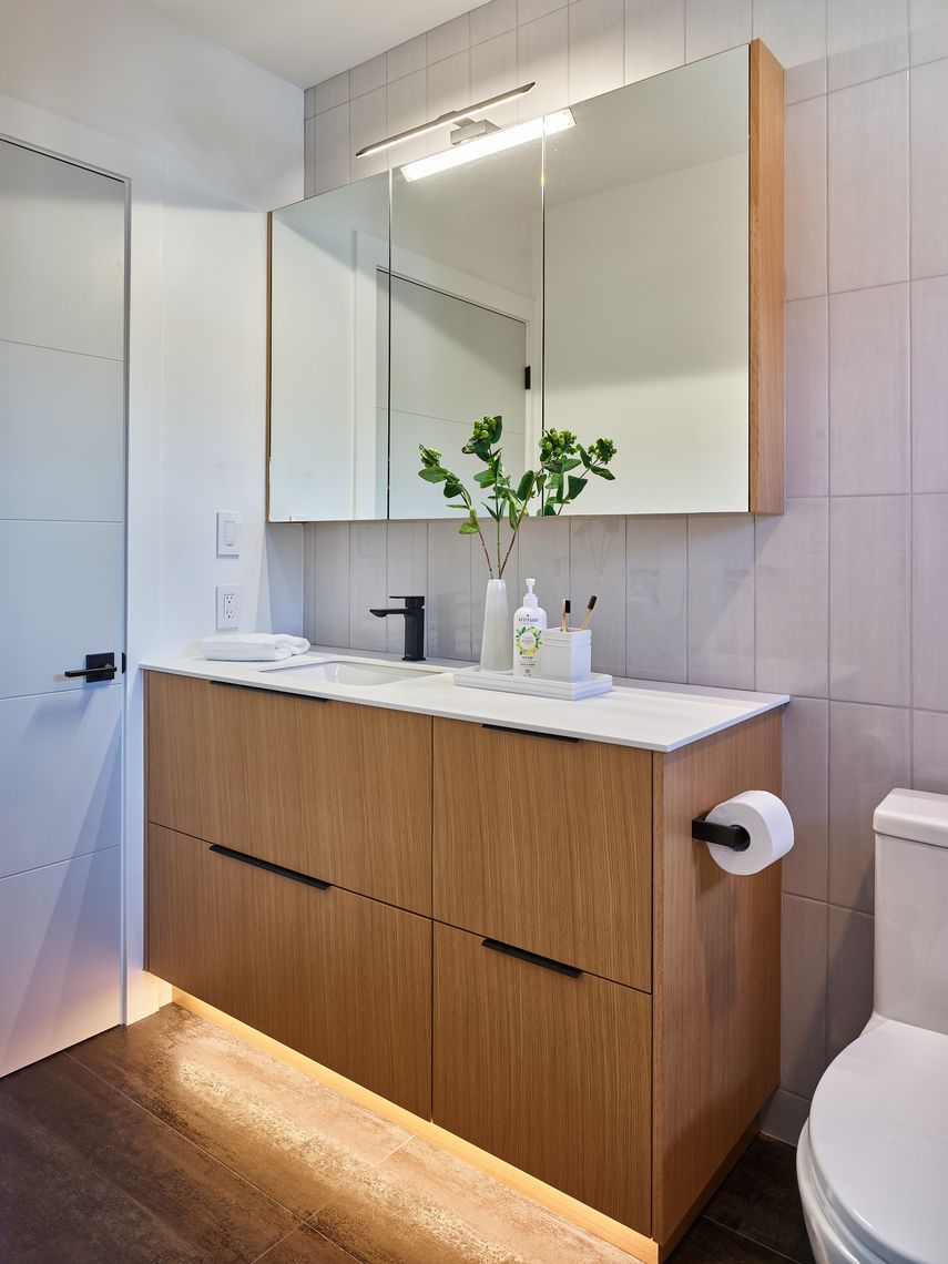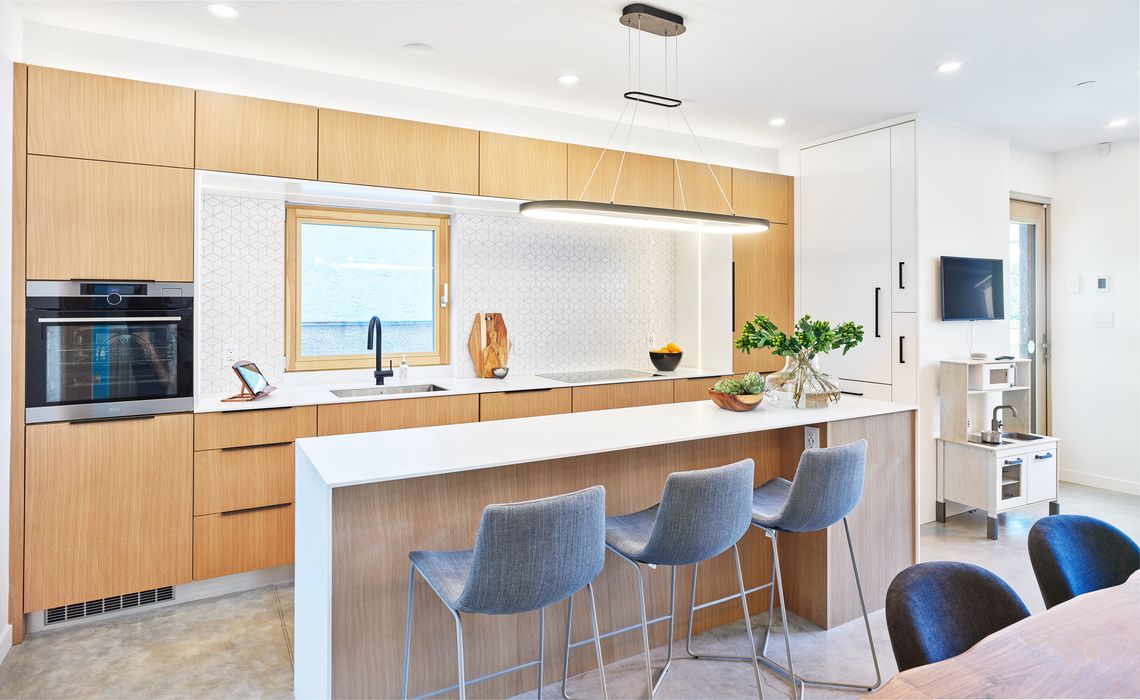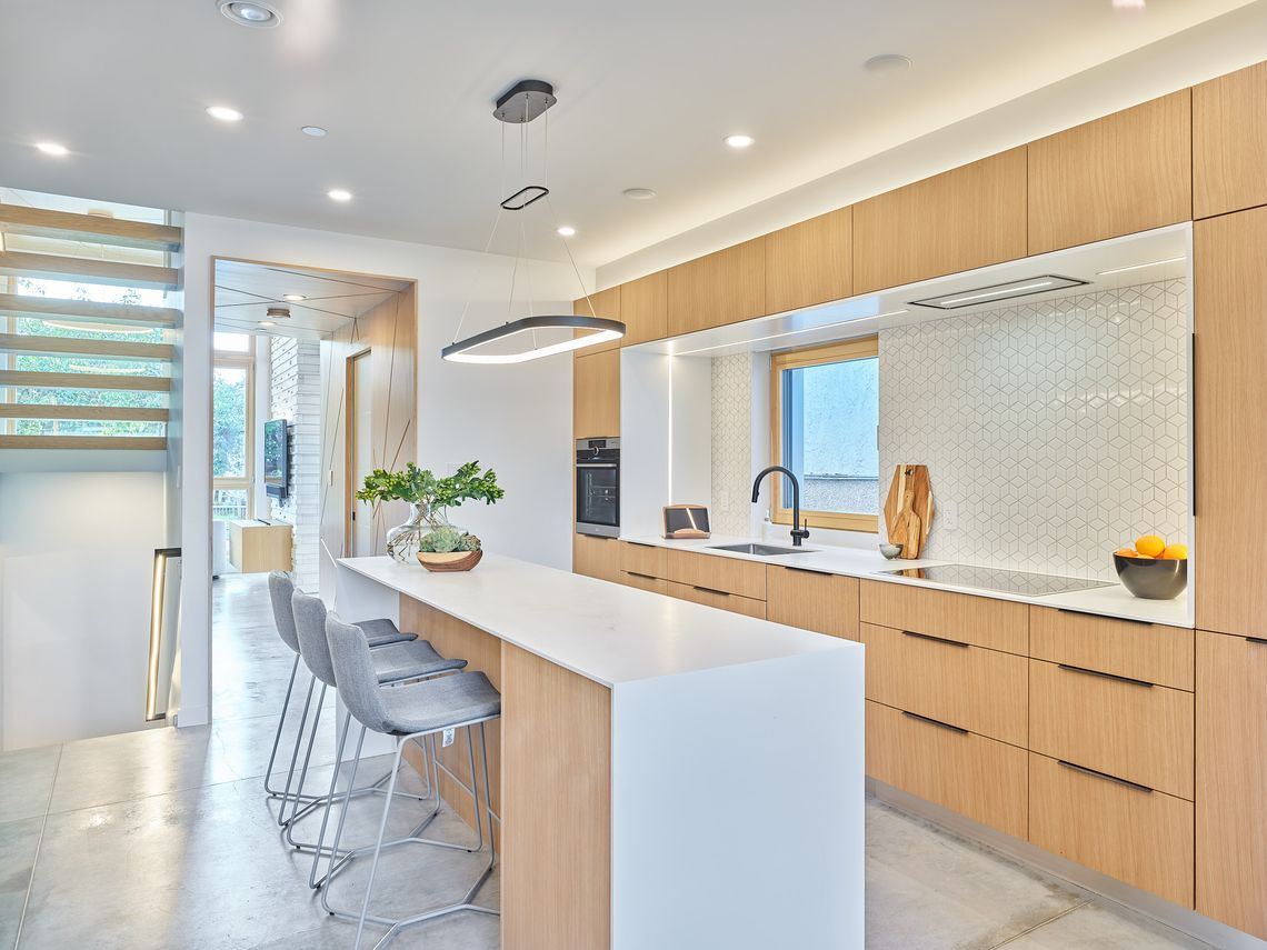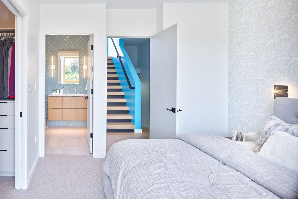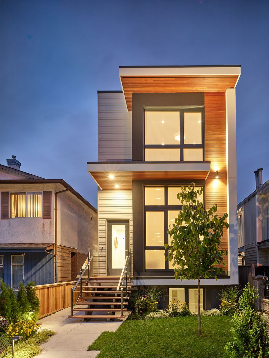 Designed as a model “house for the future,” and to last to 100 years, this 2,650-square-foot home on a 25x122-foot lot is Certified Passive House. Adding to the challenge: the house sits atop 46 shoring piles on account of being built on a peat bog. Inside, the flexible layout offers five bedrooms and five bathrooms, plus a secondary basement suite with 8.5-foot ceilings, walk-out patio, and floor-to-ceiling glazing.